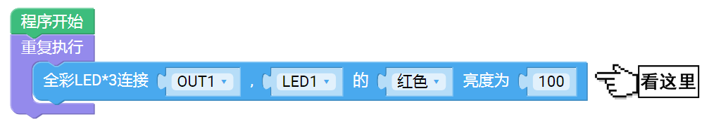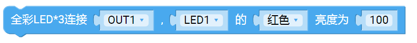 此代码块效果:控制接在OUT1引脚上的全彩LED3模块的第一个灯光发红光,亮度为100。