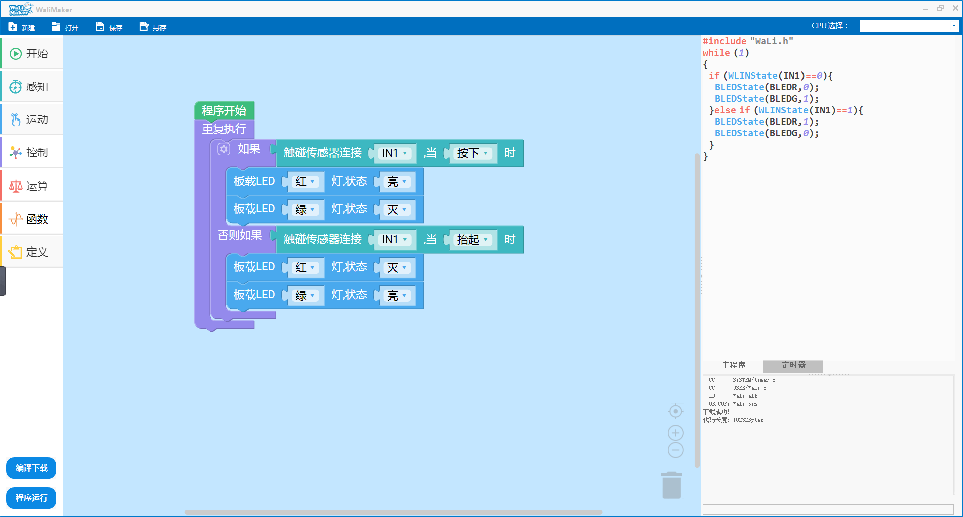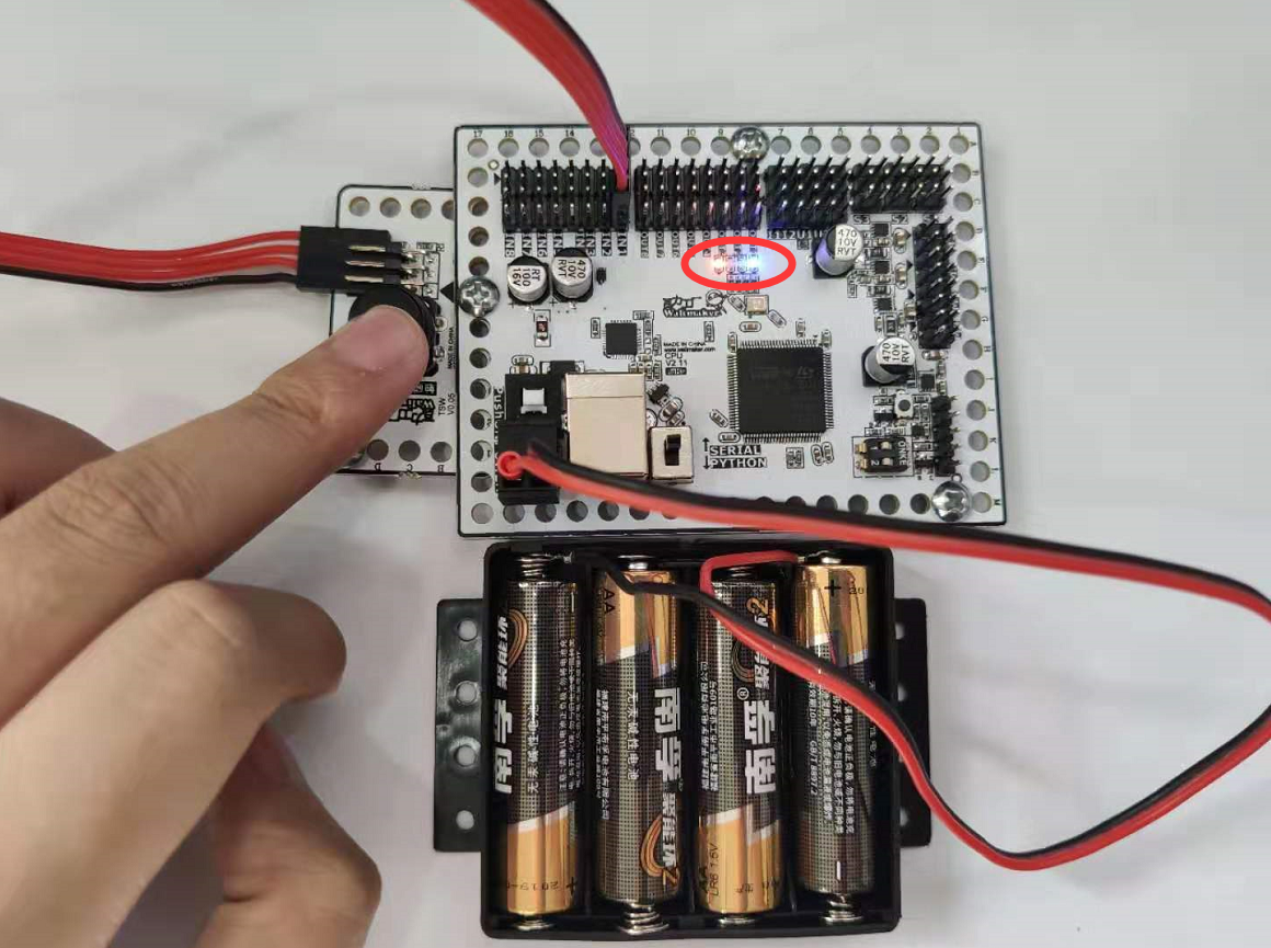 如上图所示,当触碰传感器被按下时,CPU板载LED红灯亮起。