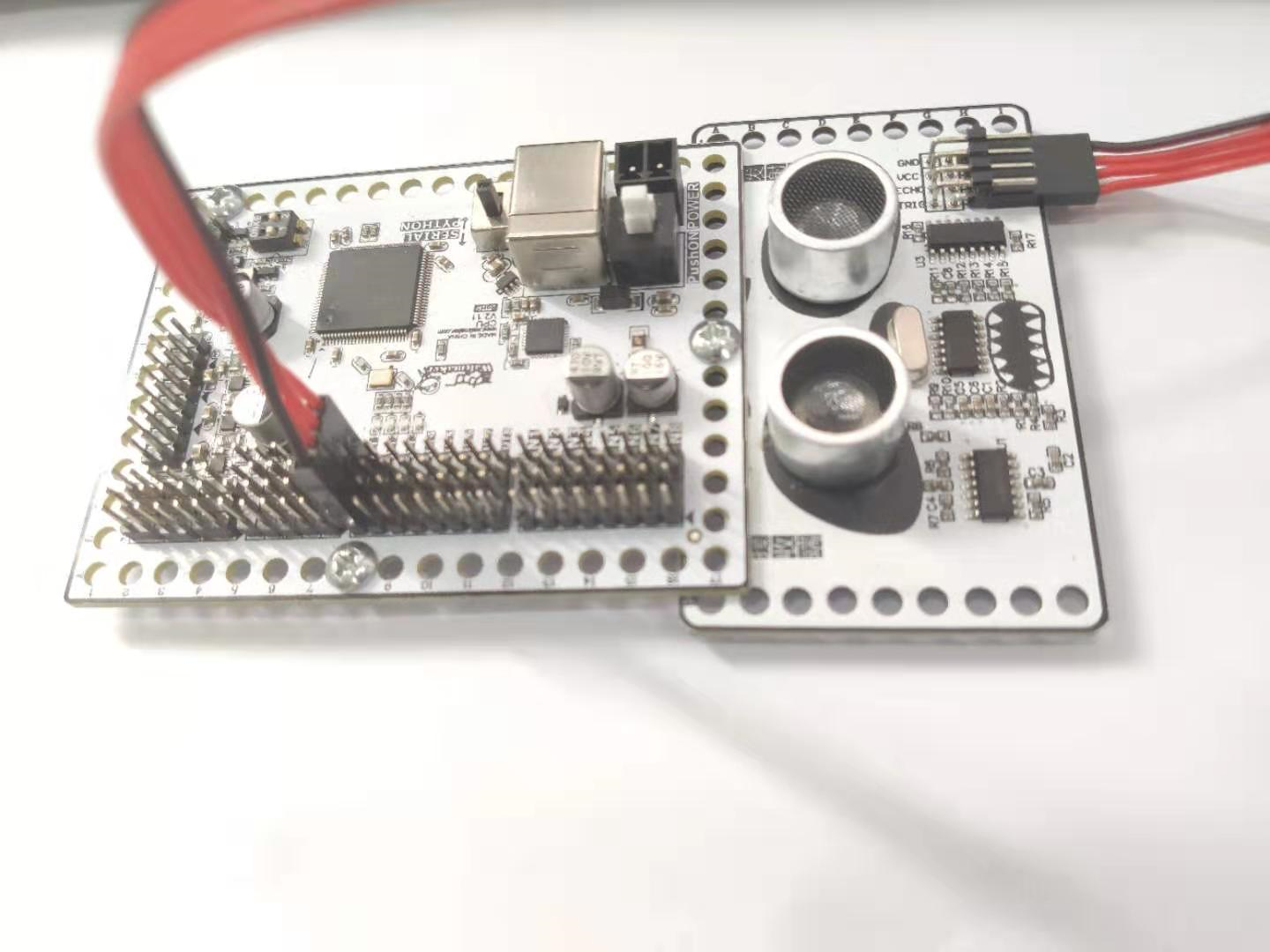 注意:超声波模块需接到CPU板上标识有 OUTx(x=1,2,3,4) 的一排引脚上,必须用4P排线 接线。上图中,模块与CPU板 OUT1 口相连。