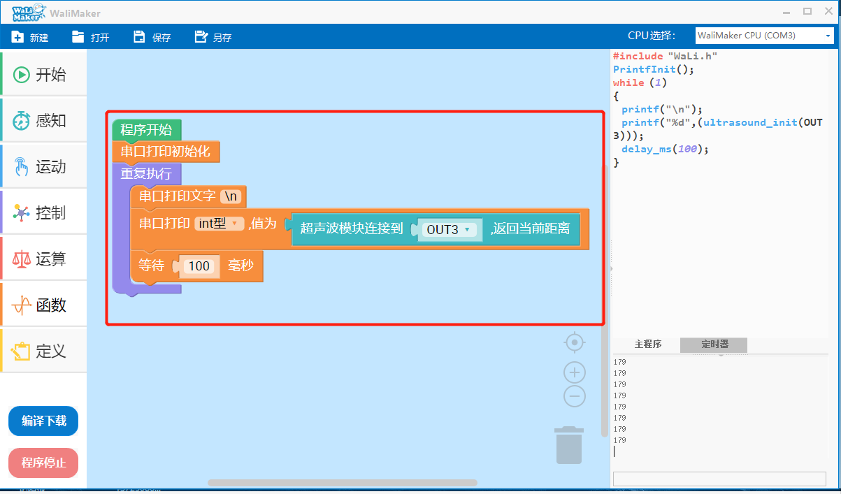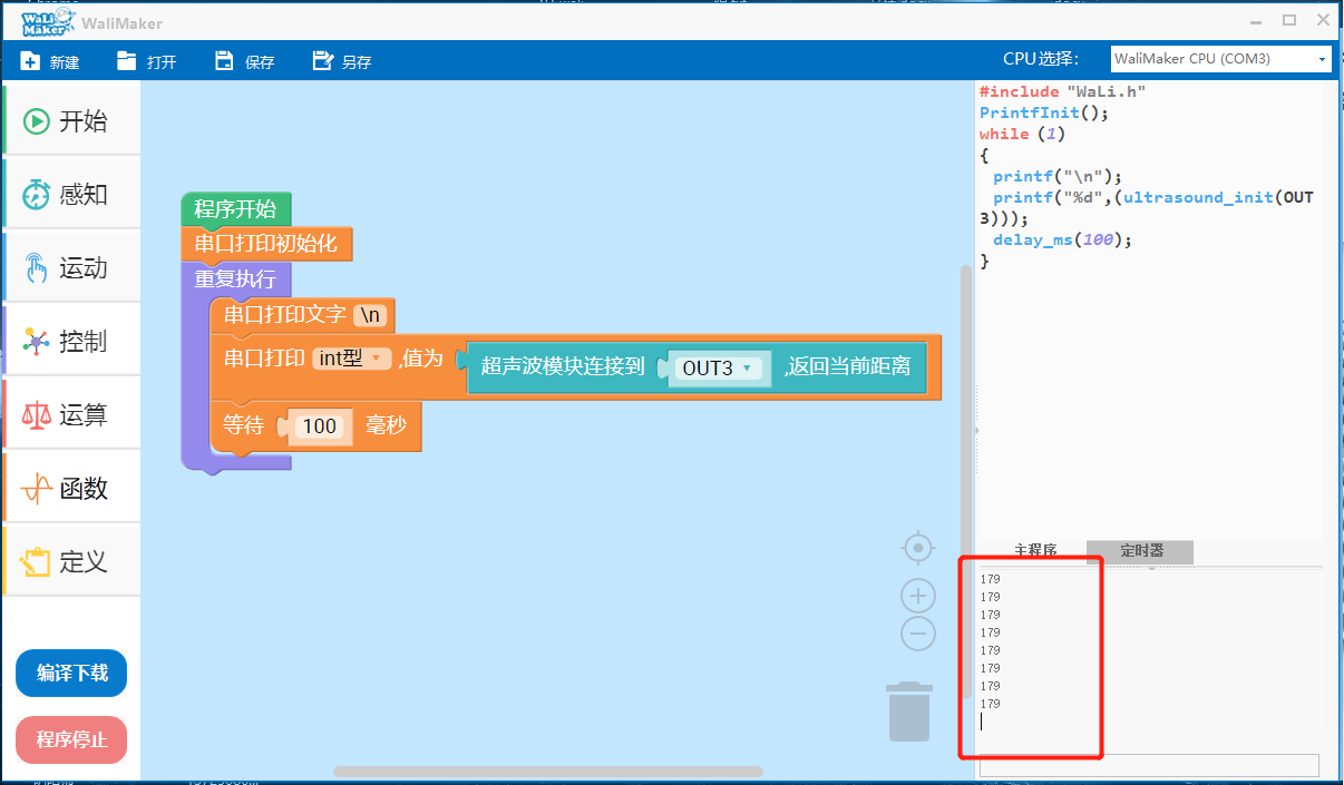 - 超声波模块获取到的距离数据的单位是厘米(cm)。
