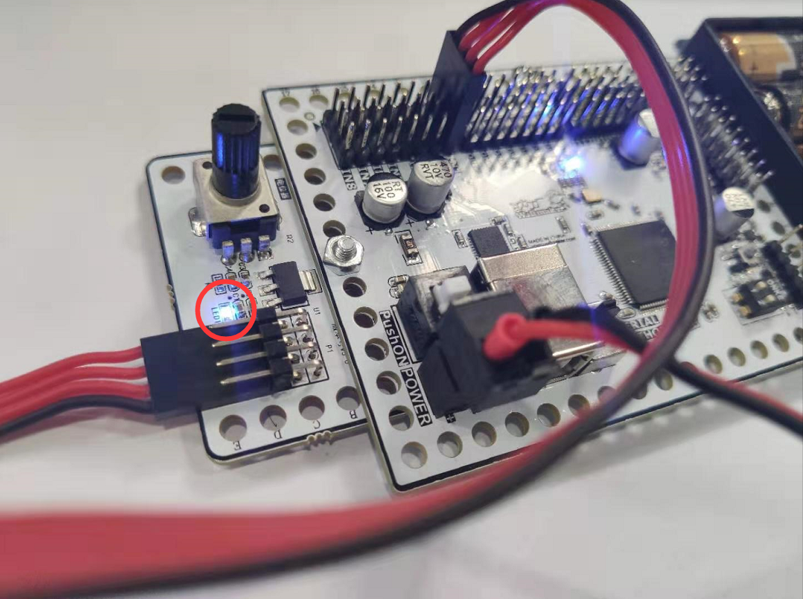 正确接线并按下电源开关后,电位器V3.0模块上蓝色电源指示灯亮起,如下图所示。