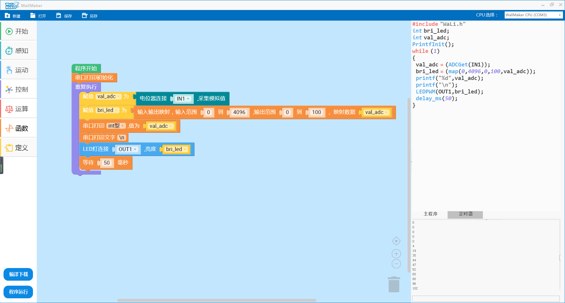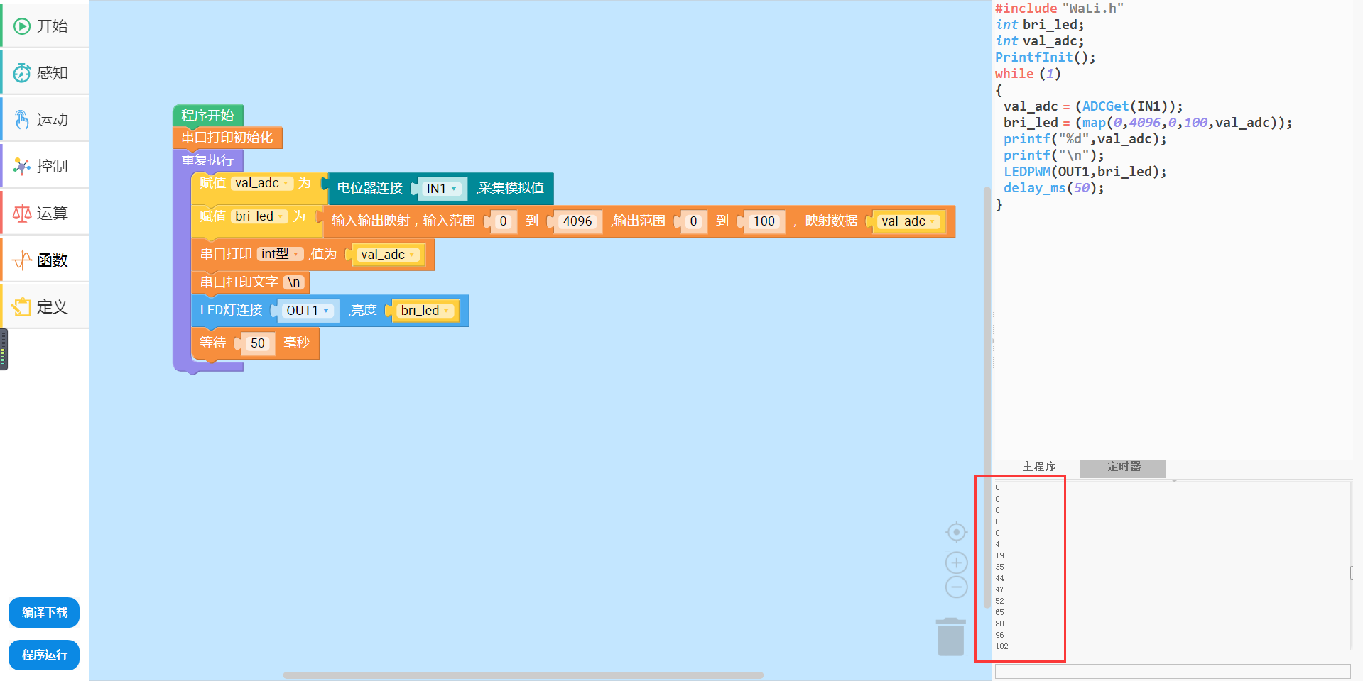图示代码解释:先采集到模块的模拟数据,赋值给名为val_adc的变量,因此该变量的数值范围为[0-4095]。接着通过映射代码块,将该变量的数据映射到[0-100]范围,并赋值给名为bri_led的变量,同时将该变量的值打印出来,且设定接在OUT1 口的LED灯亮度为该变量的值。