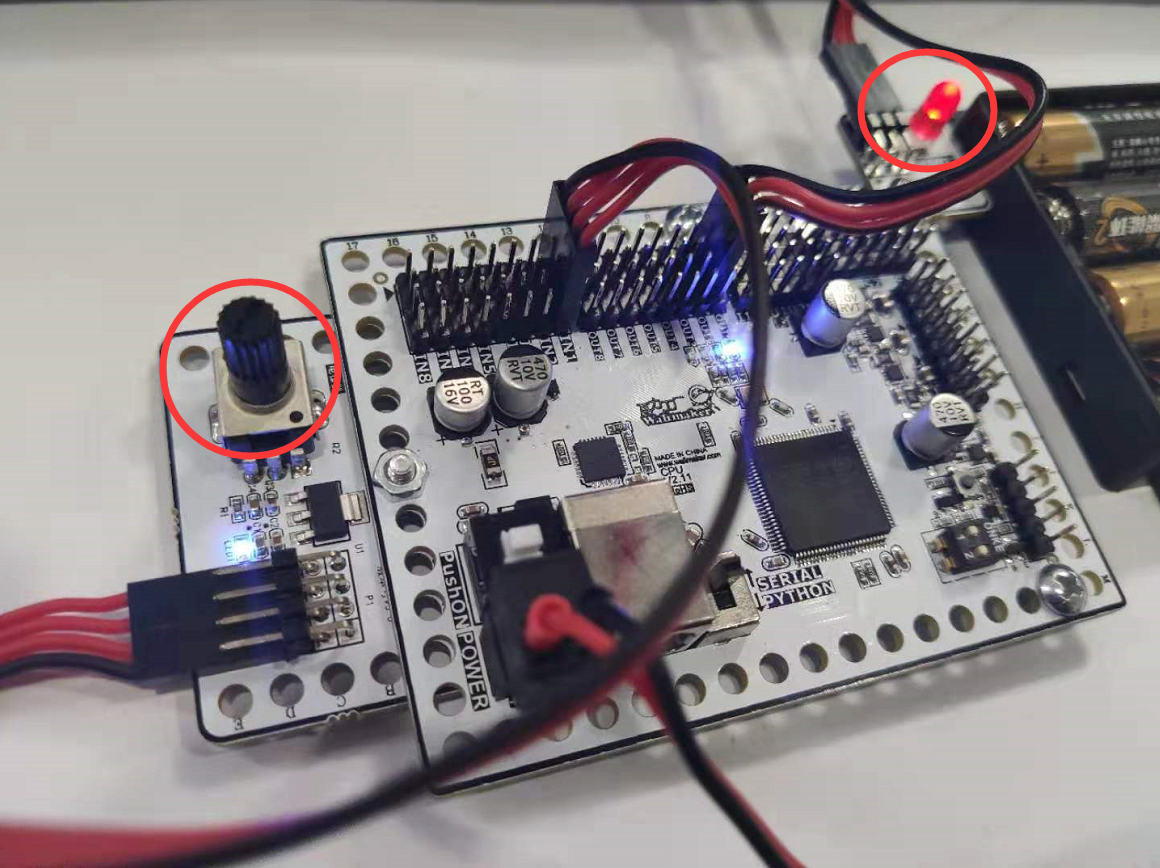 手动调节旋钮,可观察到LED灯亮度随之变亮变暗(请自行动手编程与搭建观察现象)。