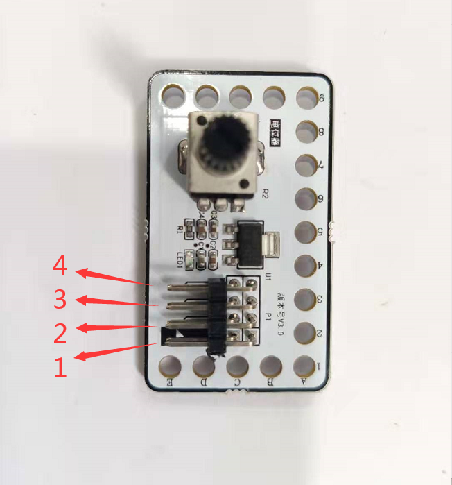 - 如上图所示,电位器V3.0模块总共有四组排针接口,但是只有三组(1 、2 、3)为有效接口,因此接线时可以用3P、4P的排线。