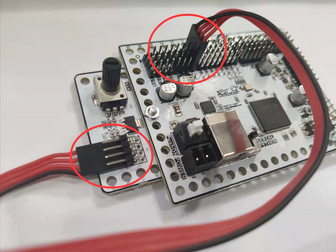 注意:电位器V3.0模块需接到CPU板上标识有 IN1-IN8 的一排引脚上。上图中,模块与CPU板 IN1口相连。