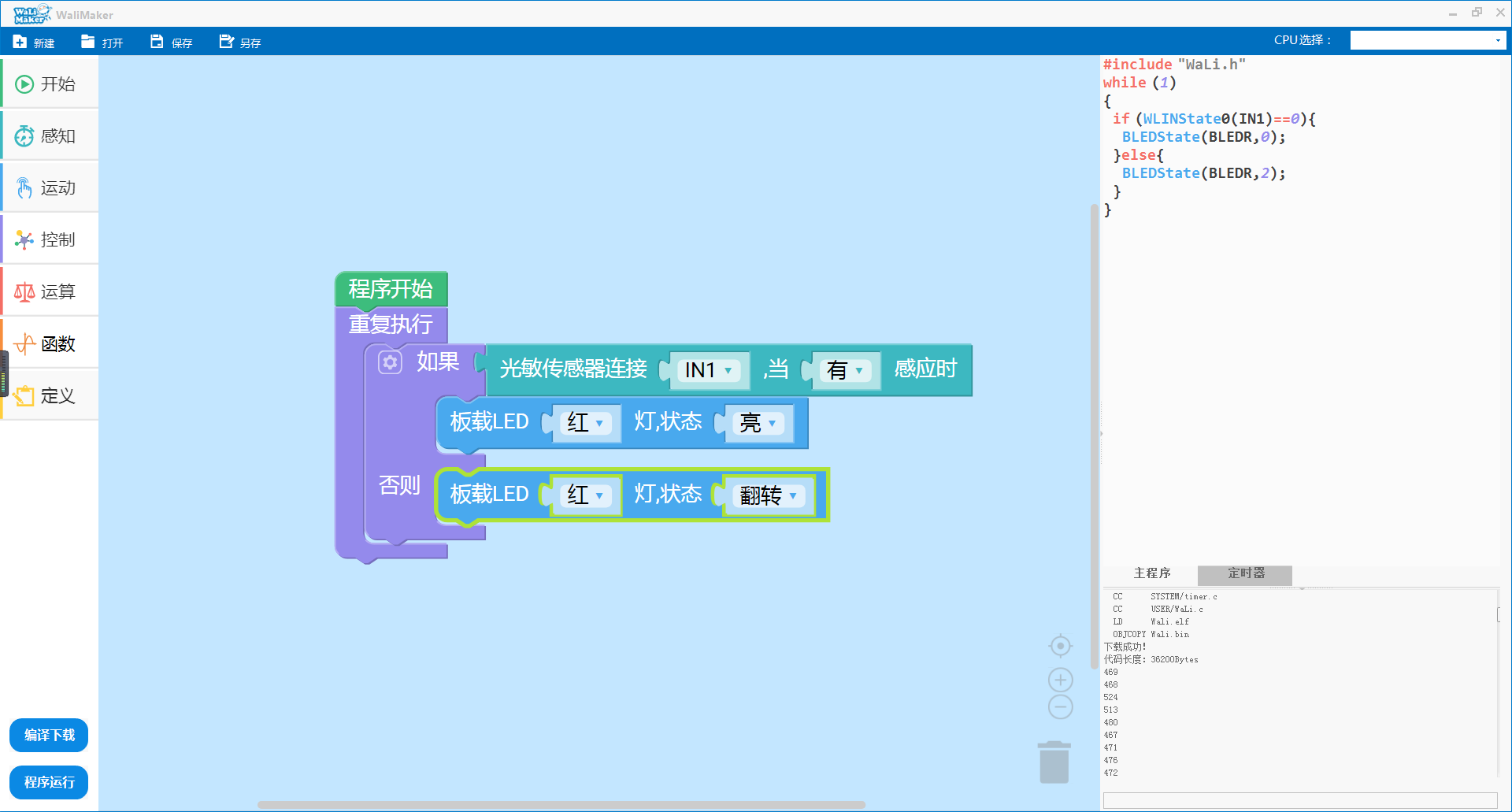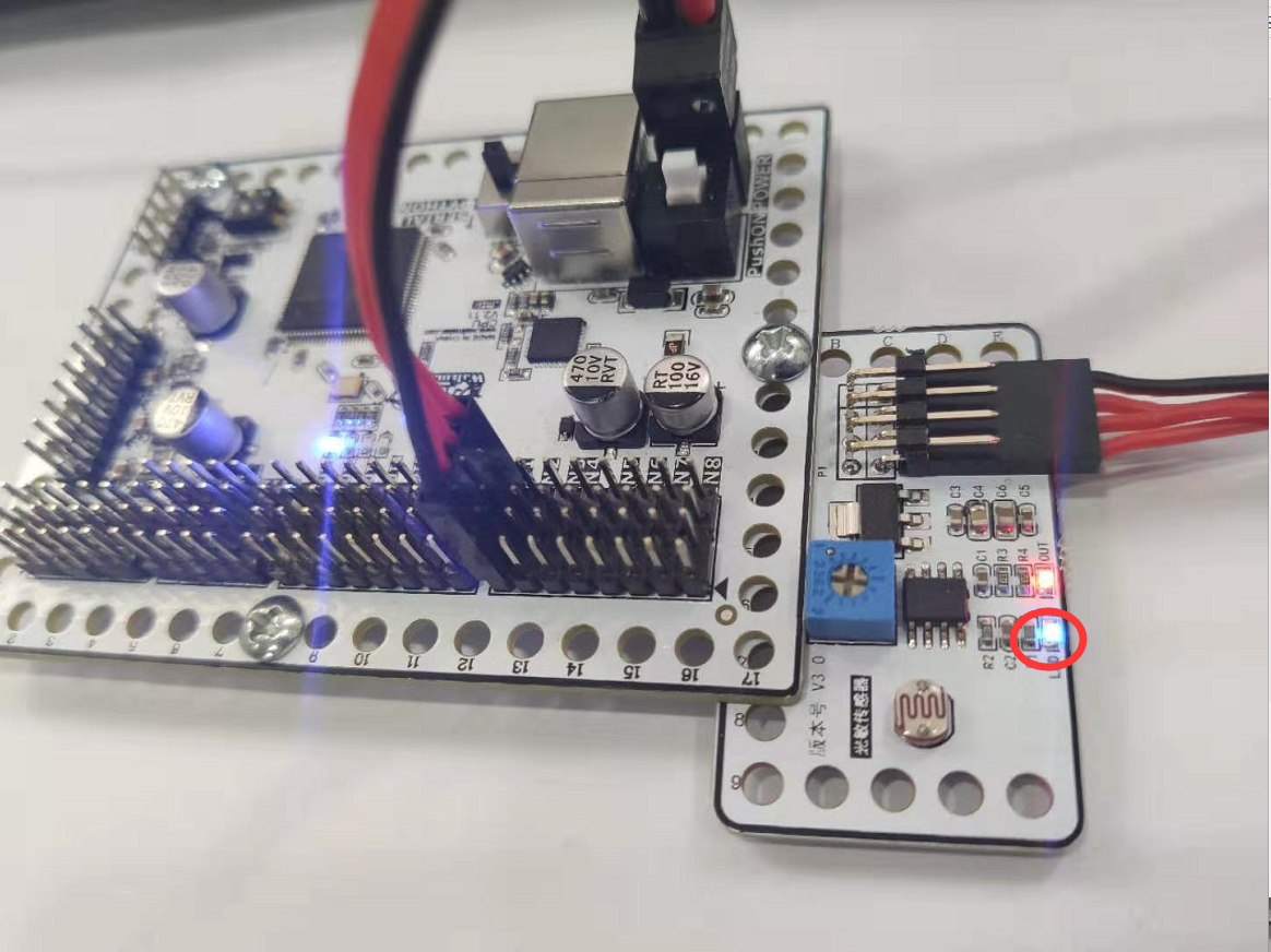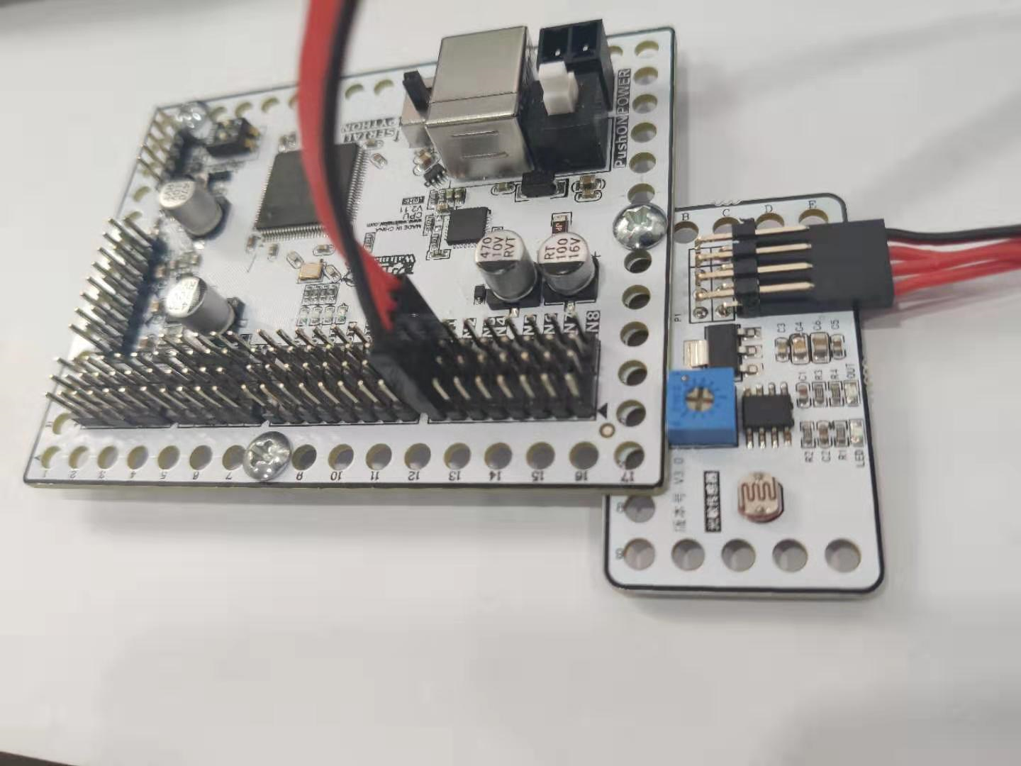 注意:光敏传感器模块需接到CPU板上标识有 INx(x=1,2,3,4,5,6,7,8) 的一排引脚上,推荐用 4P排线 接线。上图中,模块与CPU板 IN1口相连。