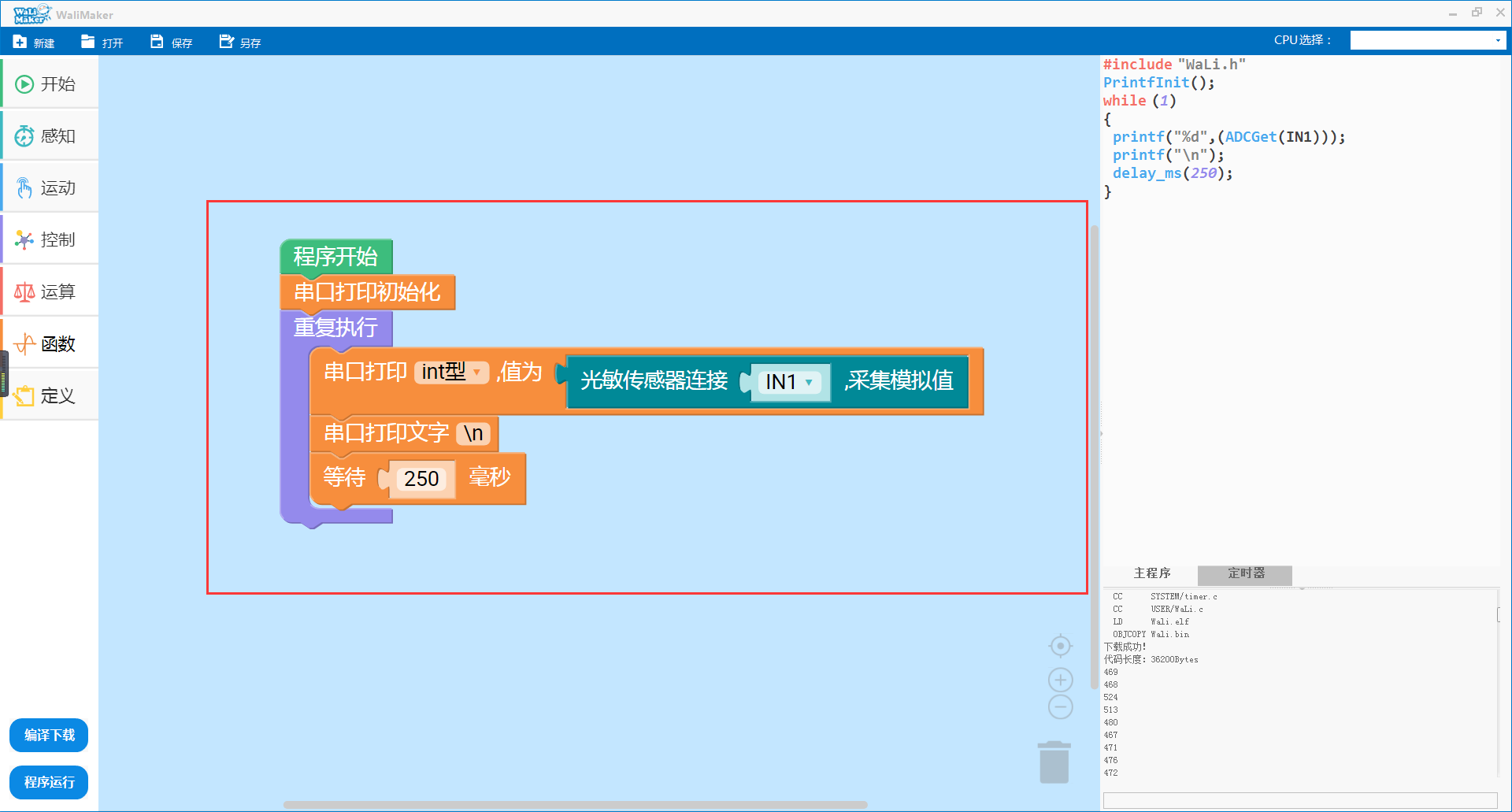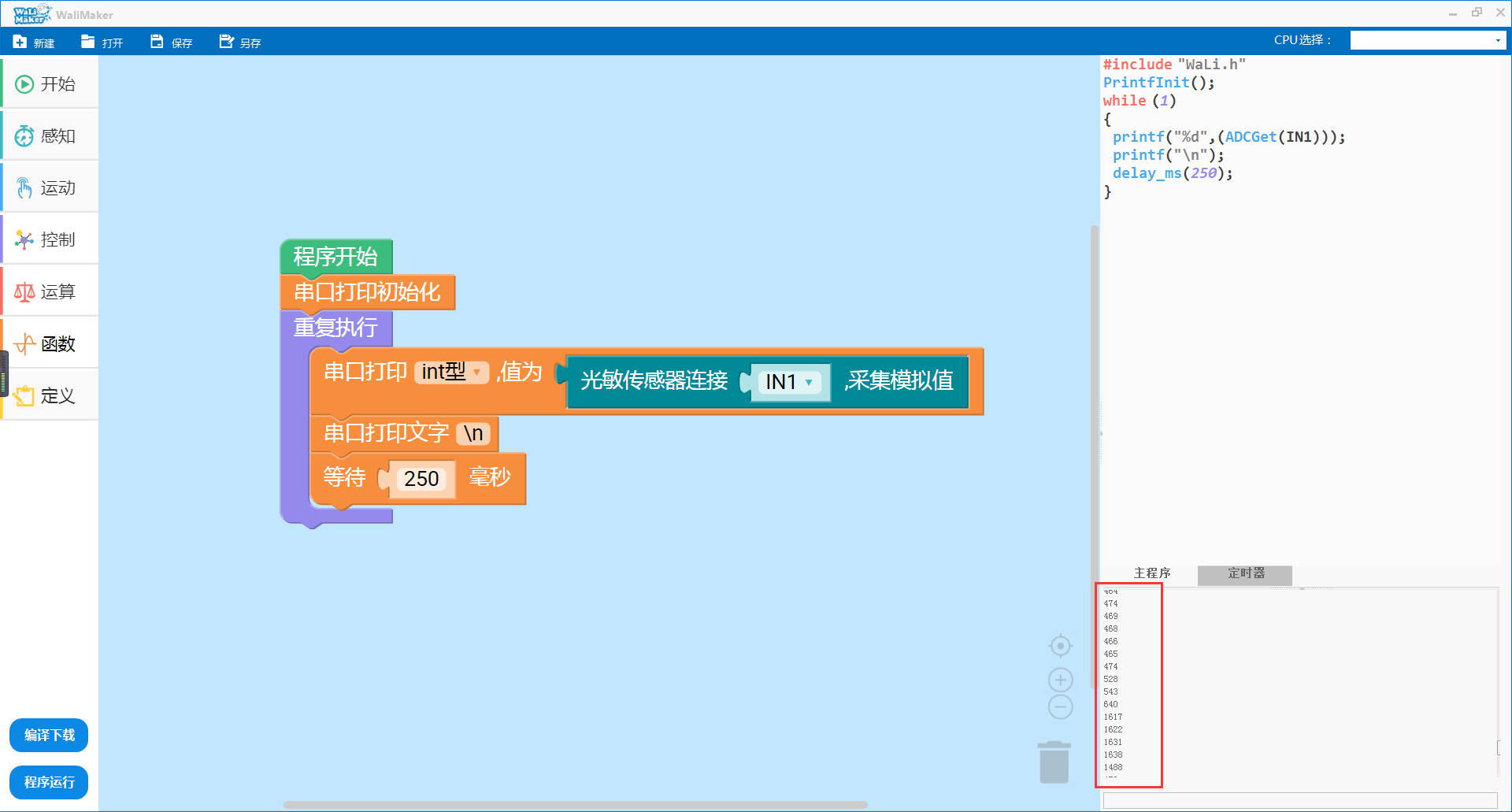 - 如图所示,串口打印区打印出了采集到的模拟信号的值,实验时将光敏敏传感器传感探头遮住,采集到的模拟信号值将会升高。