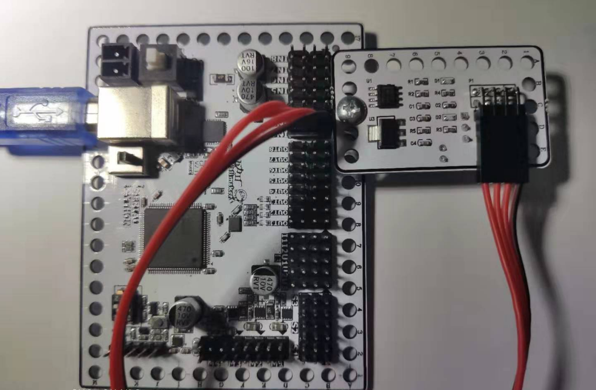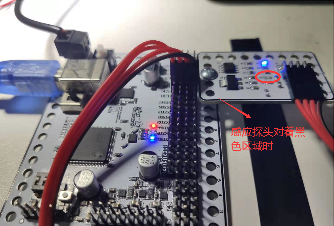 注意:红外传感器(不可调)需接到CPU板上标识有 INx(x=1,2,3,4,5,6,7,8) 的一排引脚上,可用 3P/4P排线 接线。上图中,模块与CPU板 IN1口相连。