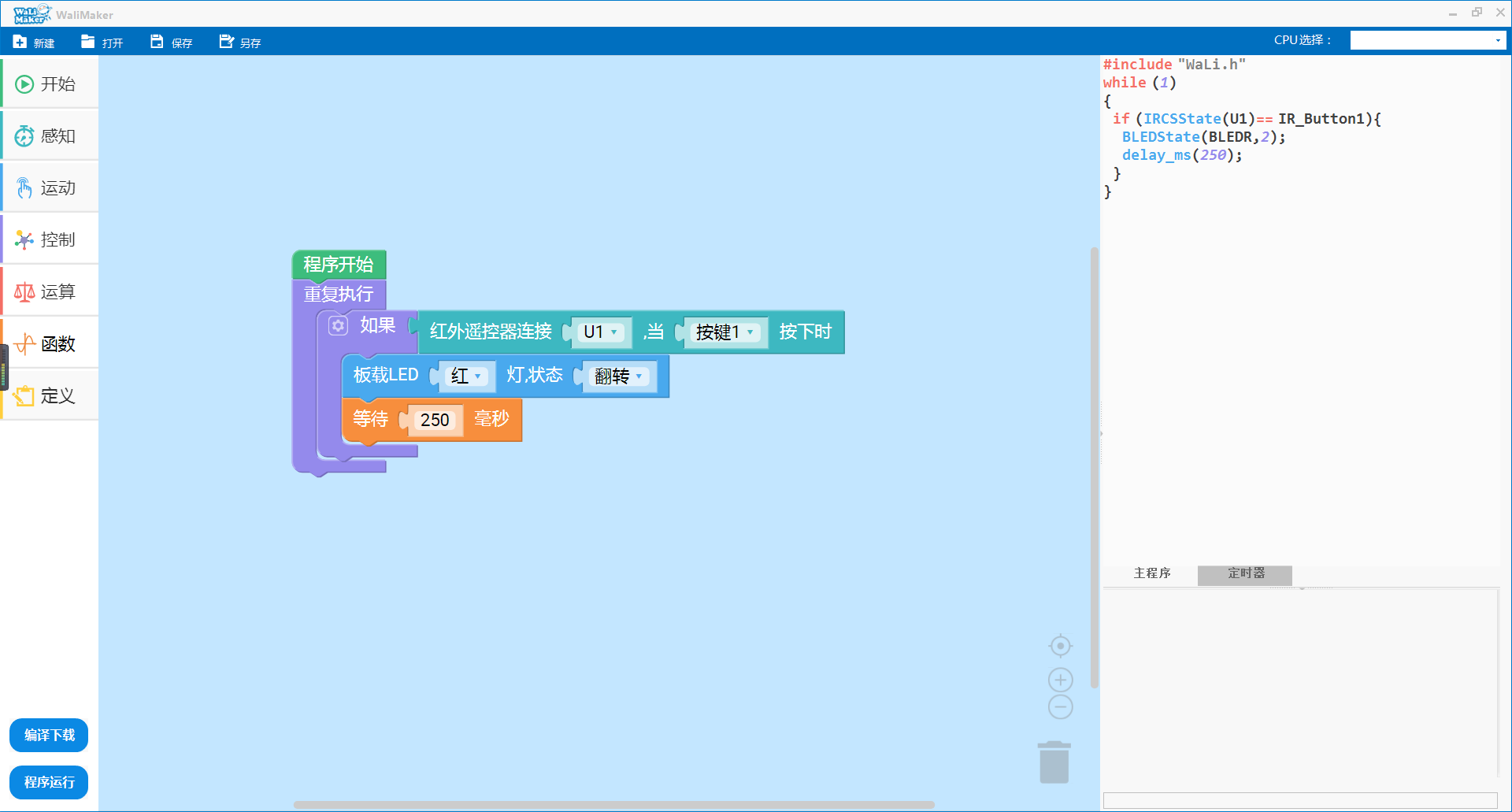 - 正确接线与编程的前提下,红外遥控器接收板能接收到红外遥控器发射板发出的信号(红外遥控器接收板上蓝色LED灯能够随着按键动作亮起),但是未出现应该出现的编程现象。该情况大多是有过接线问题导致红外遥控器接收板部分电路损坏导致的。
