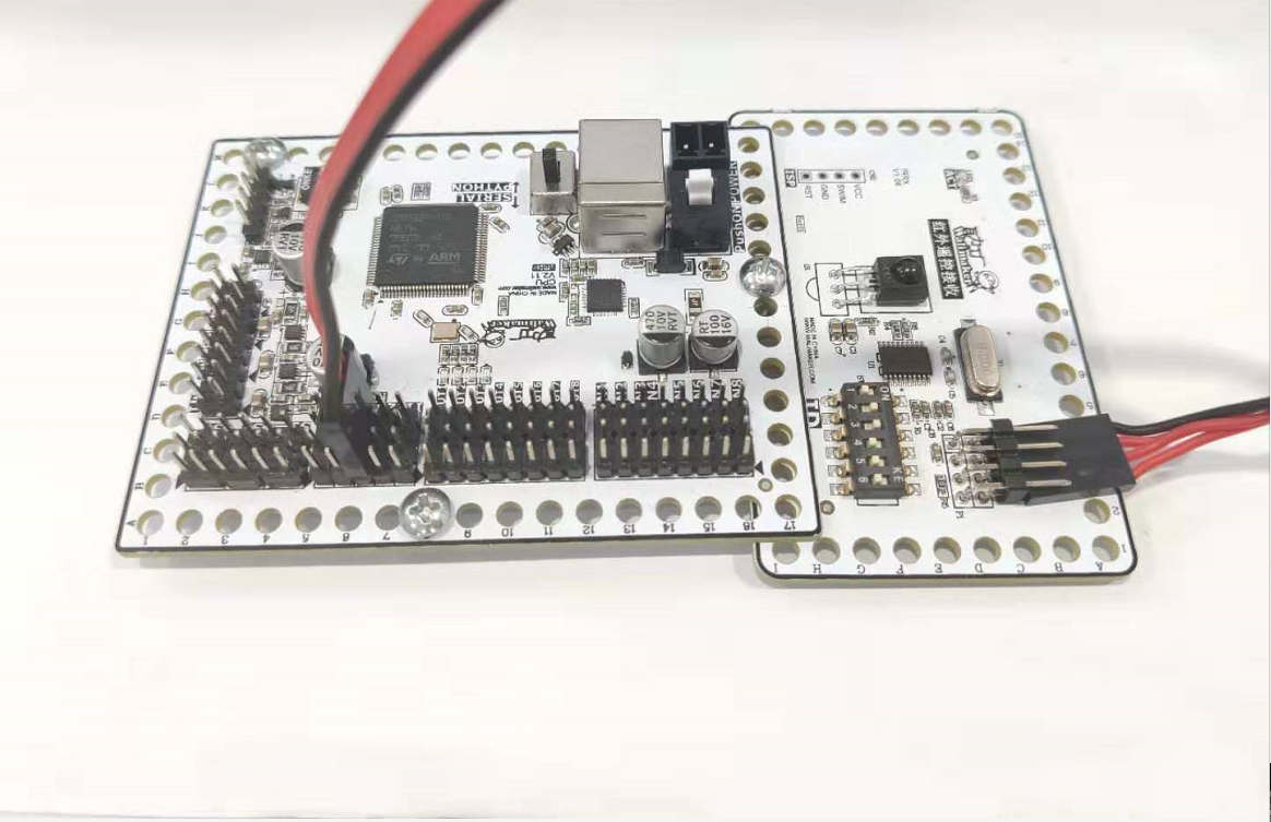 - 正确接线和下载代码运行后,当红外遥控器发射板持续1按下按键1,红外遥控器接收板接收到信号后板载LED红灯将会闪烁。