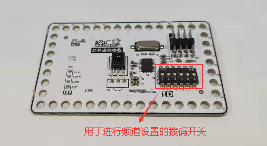 - 考虑到同一个场地可能有多套红外遥控器同时使用,红外遥控器之间势必会相互干扰。利用红外遥控器发射板和接收板上的拨码进行频道设置可防止干扰。