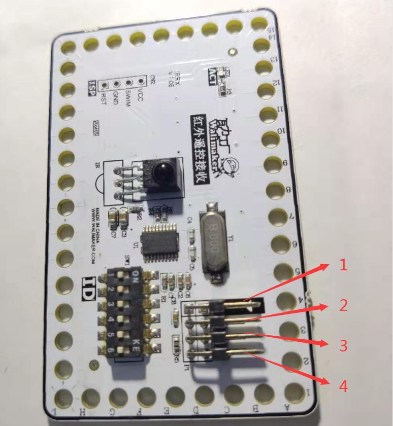 - 如上图所示(有部分版本为3排针),红外遥控器接收板总共有四组排针接口,但是只有前三组为有效接口(因此3P排针版本和4P排针版本接口功能是一样的),接线时可用3P、4P的排线。