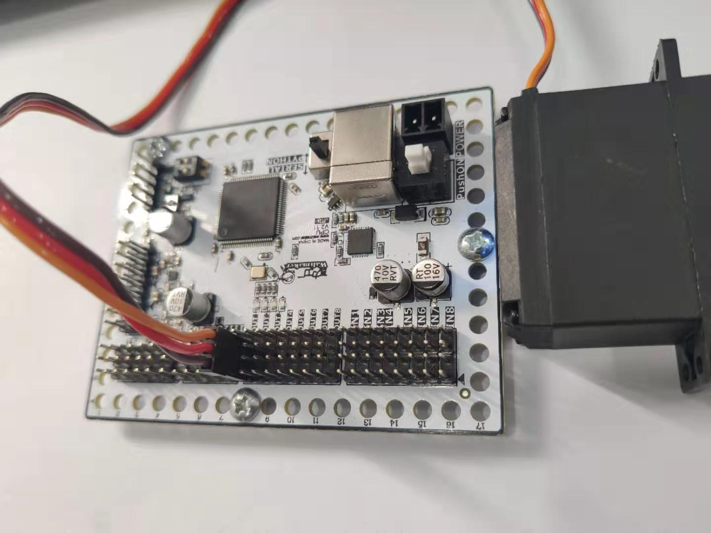 注意:伺服马达需接到CPU板上标识有 OUTx(x=1,2,3,4,5,6,7,8) 的一排引脚上。上图中,伺服马达与CPU板 OUT1 口相连。