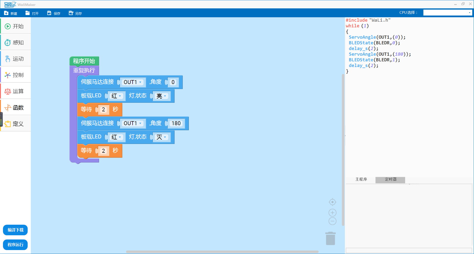 - 伺服马达转轴上电后只能在0~180°范围内转动,编程代码块设定的角度值为一个定位角度,当运行到某个代码块时,转轴会自动定位并转到该角度位置。