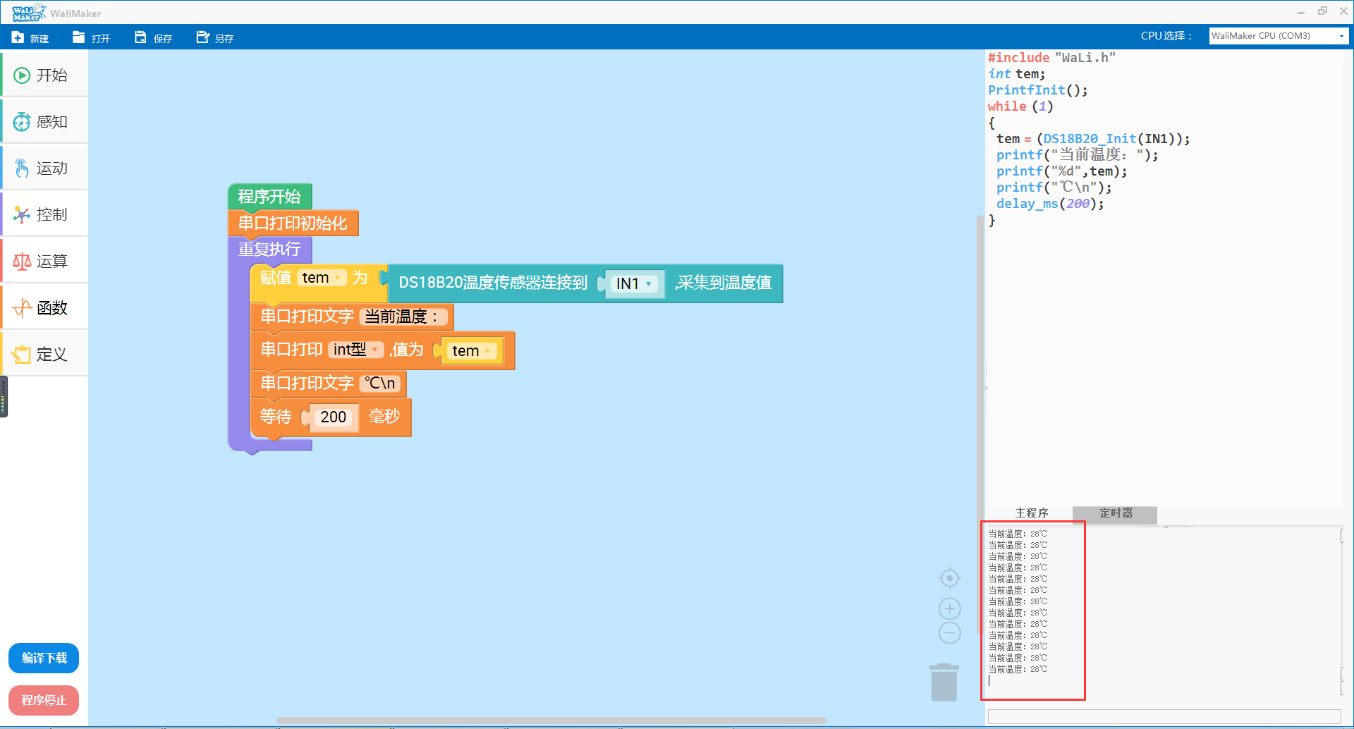 - DS18B20温度传感器模块正确接线后,可通过编程软件编程获取当前周围环境的温度。