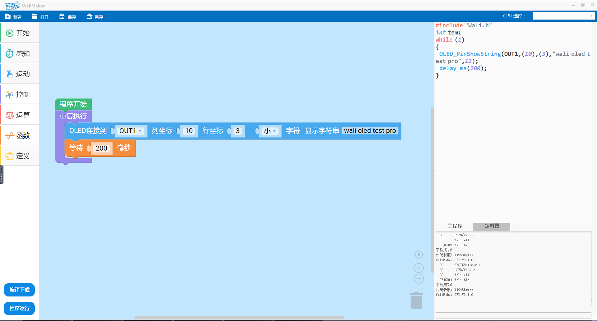 注意:OLED液晶显示模块需接到CPU板上标识有 OUT1-OUT8 的一排引脚上。上图中,模块与CPU板 OUT1口相连。