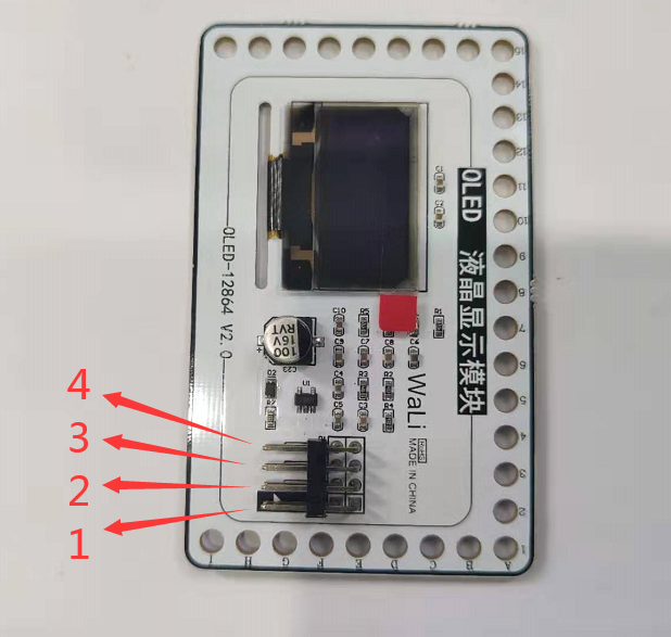 - 如上图所示,OLED液晶显示模块总共有四组排针接口,并且四组接口均为有效接口,因此接线时必须用4P的排线。